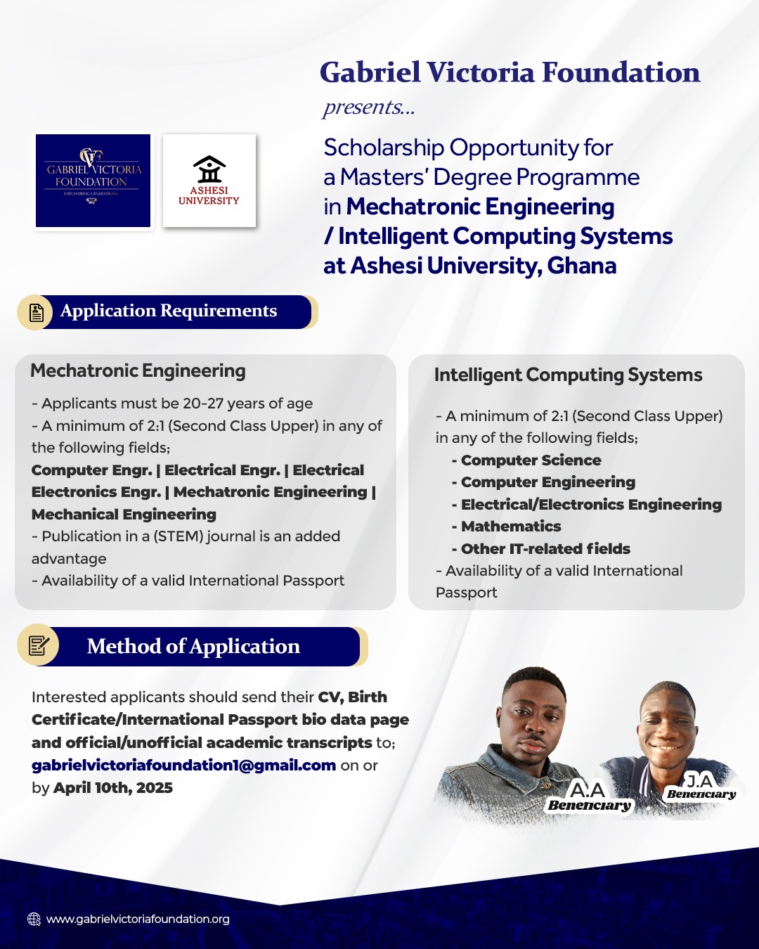 Gabriel Victoria Foundation hereby invites suitable and qualified individuals to apply for a Master Degree programmes in Mechatronic Engineering / Intelligent Computing System at Ashesi University, Gh